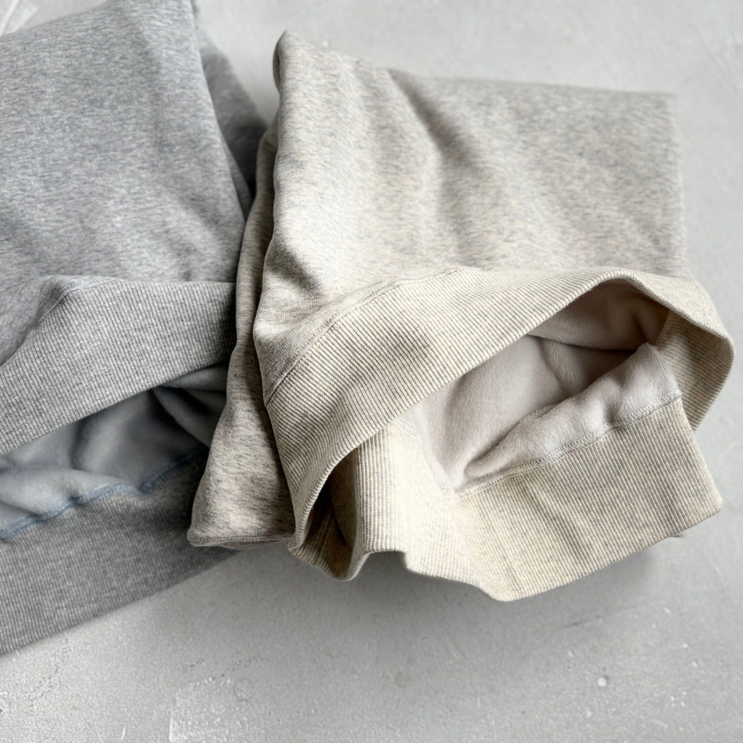 ウルトラブラッシュ裏起毛肌触りのいい起毛面とストレッチが特徴の新素材 軽くて裏がふわふわのあったか裏起毛 表面をハイゲージで編みたてているため、カジュアルながらきれい目な印象です キックバックもいいので高密度な気も浮かんで見た目はスッキリでふわふわな生地です Polyester62%、Cotton 35%、polyurethane3% |