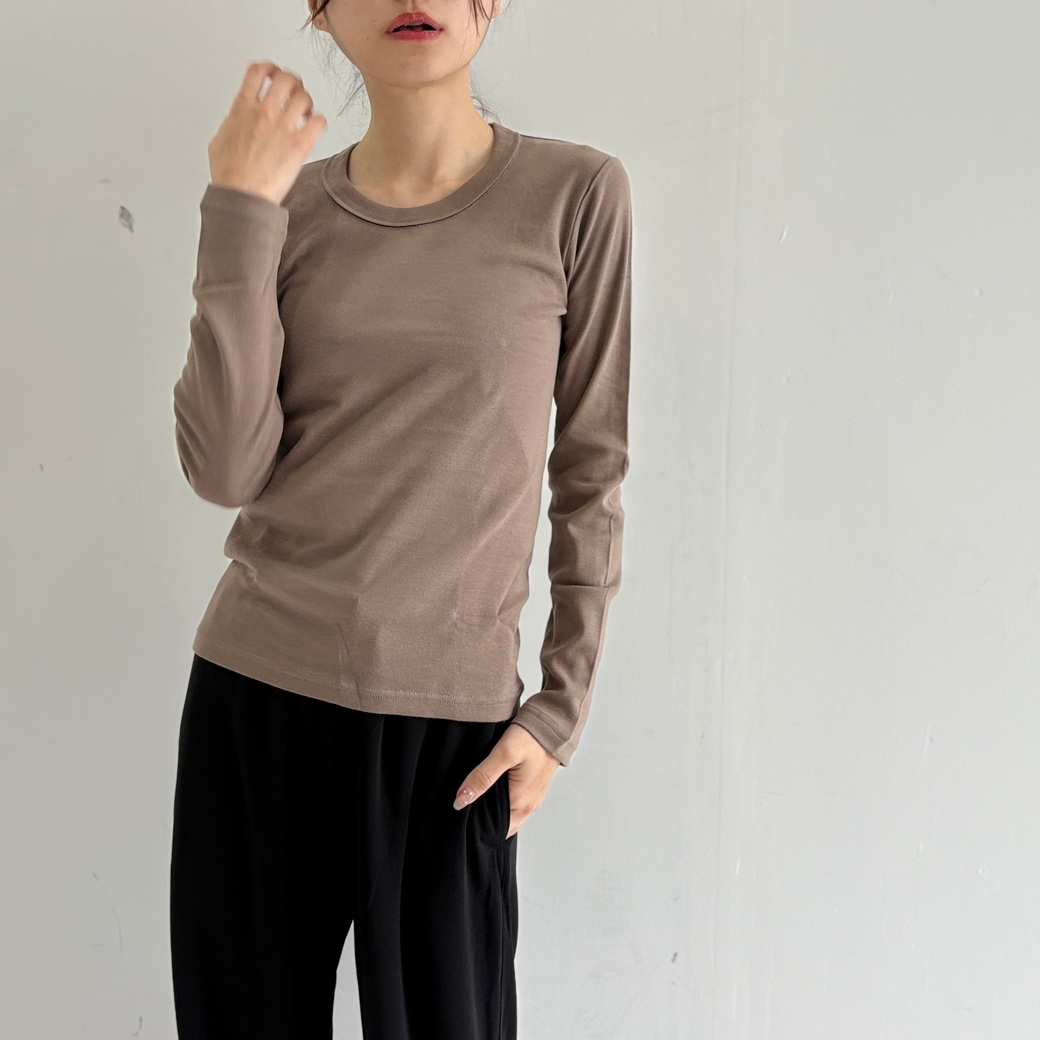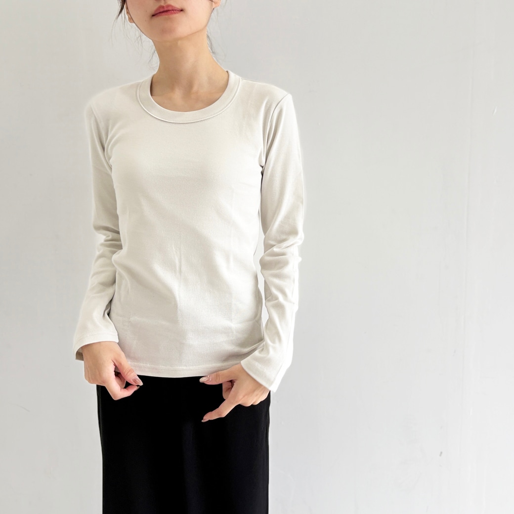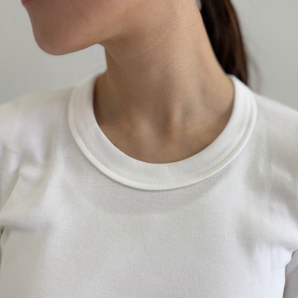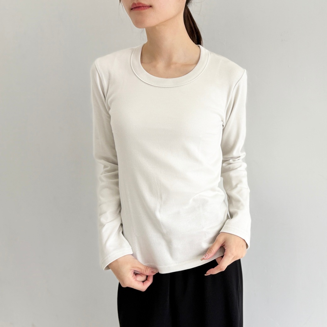 丸胴コットンシリーズのクルーネックより狭い衿あき 太目のリブ切り替えが特徴でカジュアルな着こなしにおススメ ジャケットのインナーでもきれいに収まります。