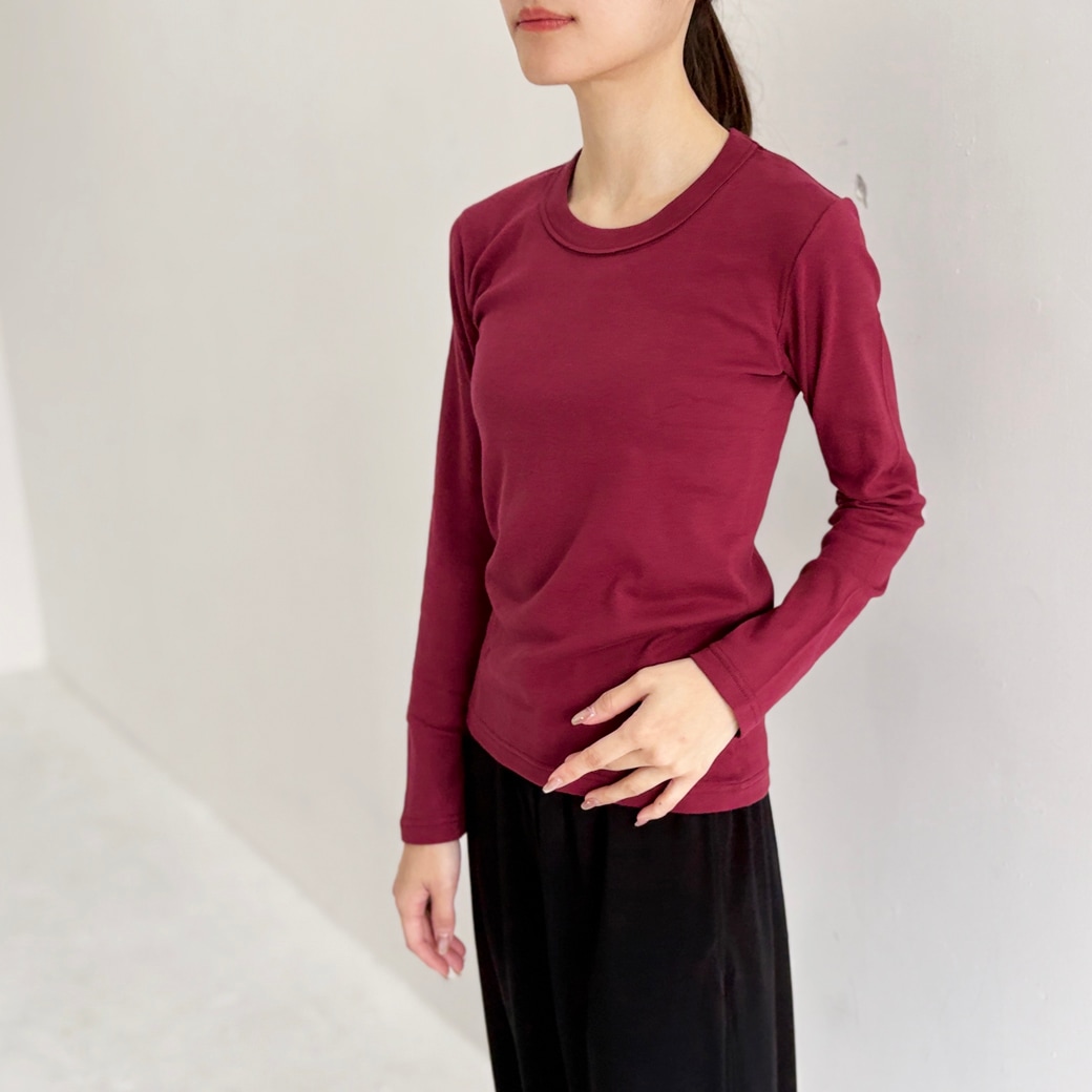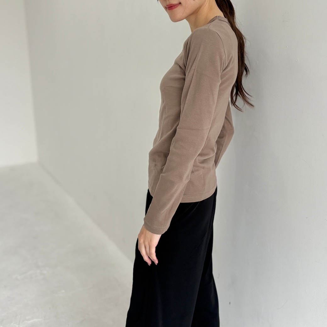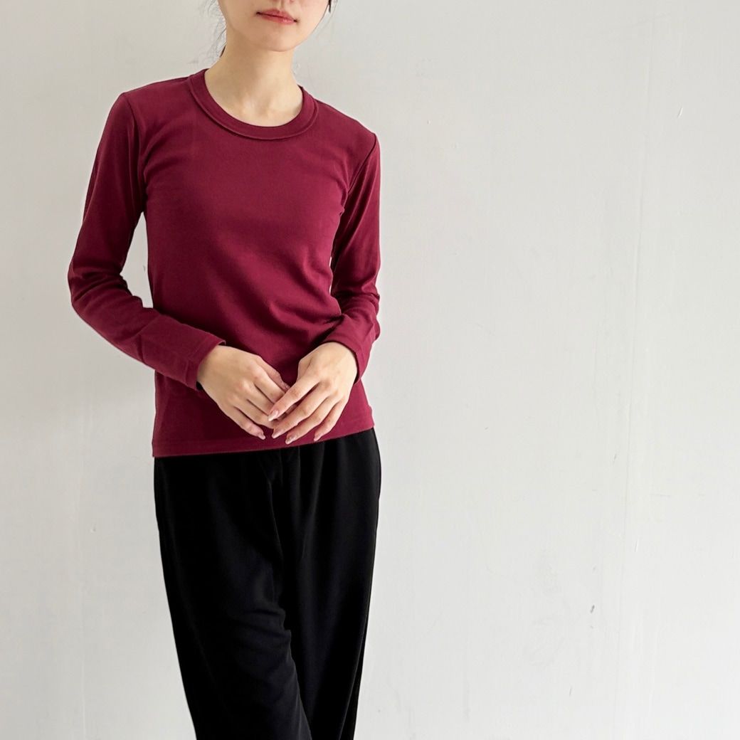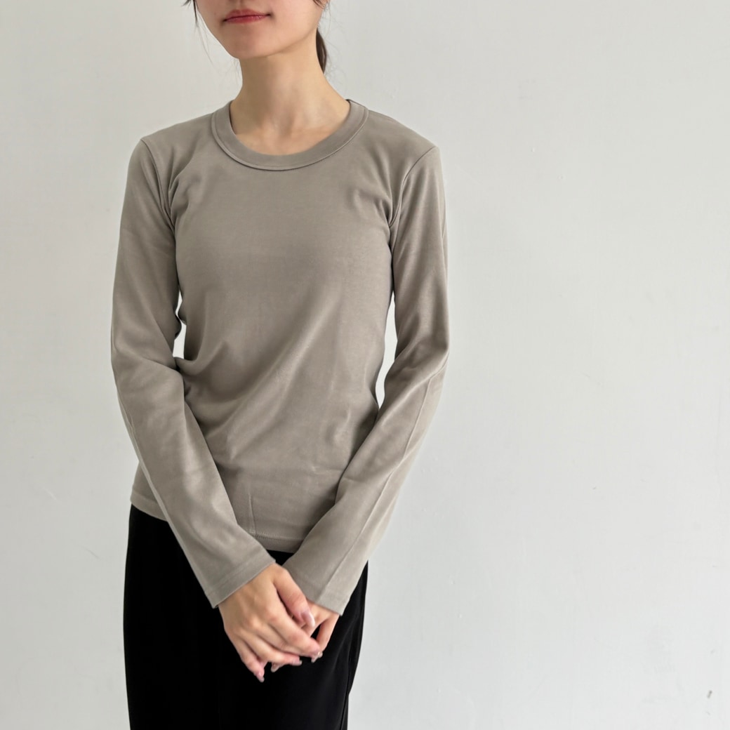 丸胴コットンシリーズのクルーネックより狭い衿あき 太目のリブ切り替えが特徴でカジュアルな着こなしにおススメ ジャケットのインナーでもきれいに収まります。