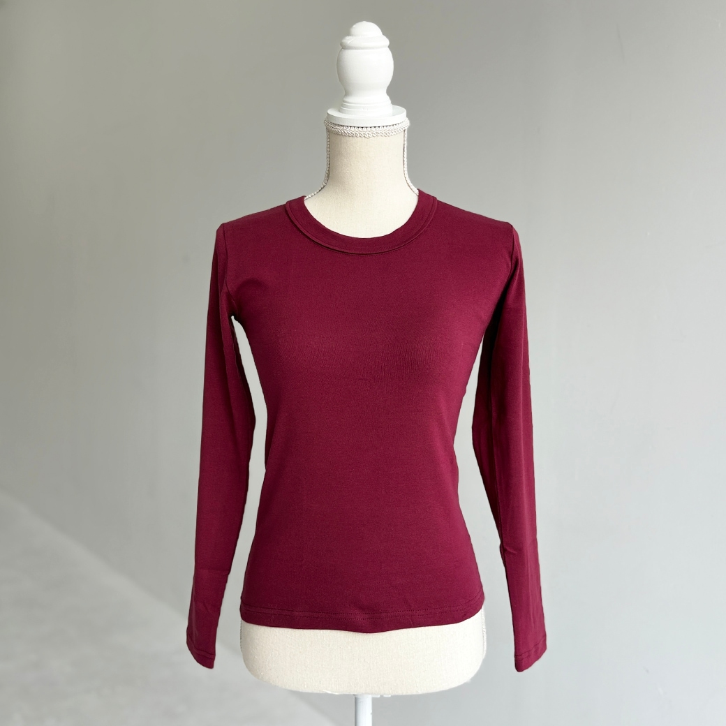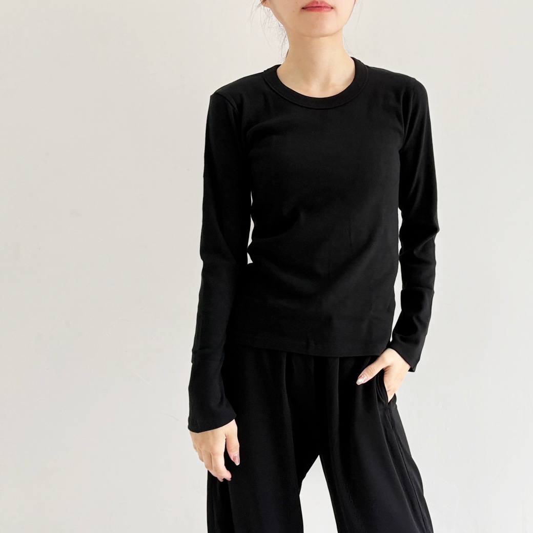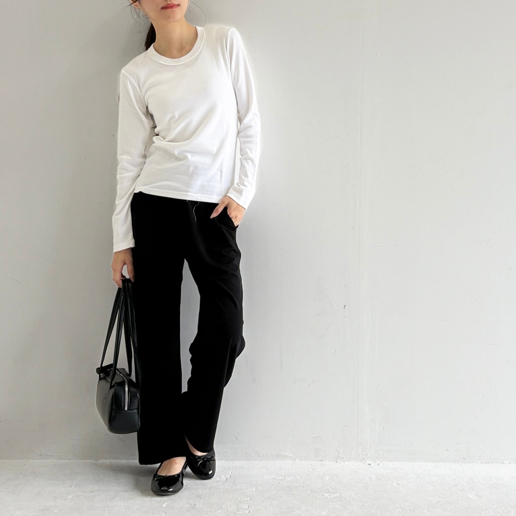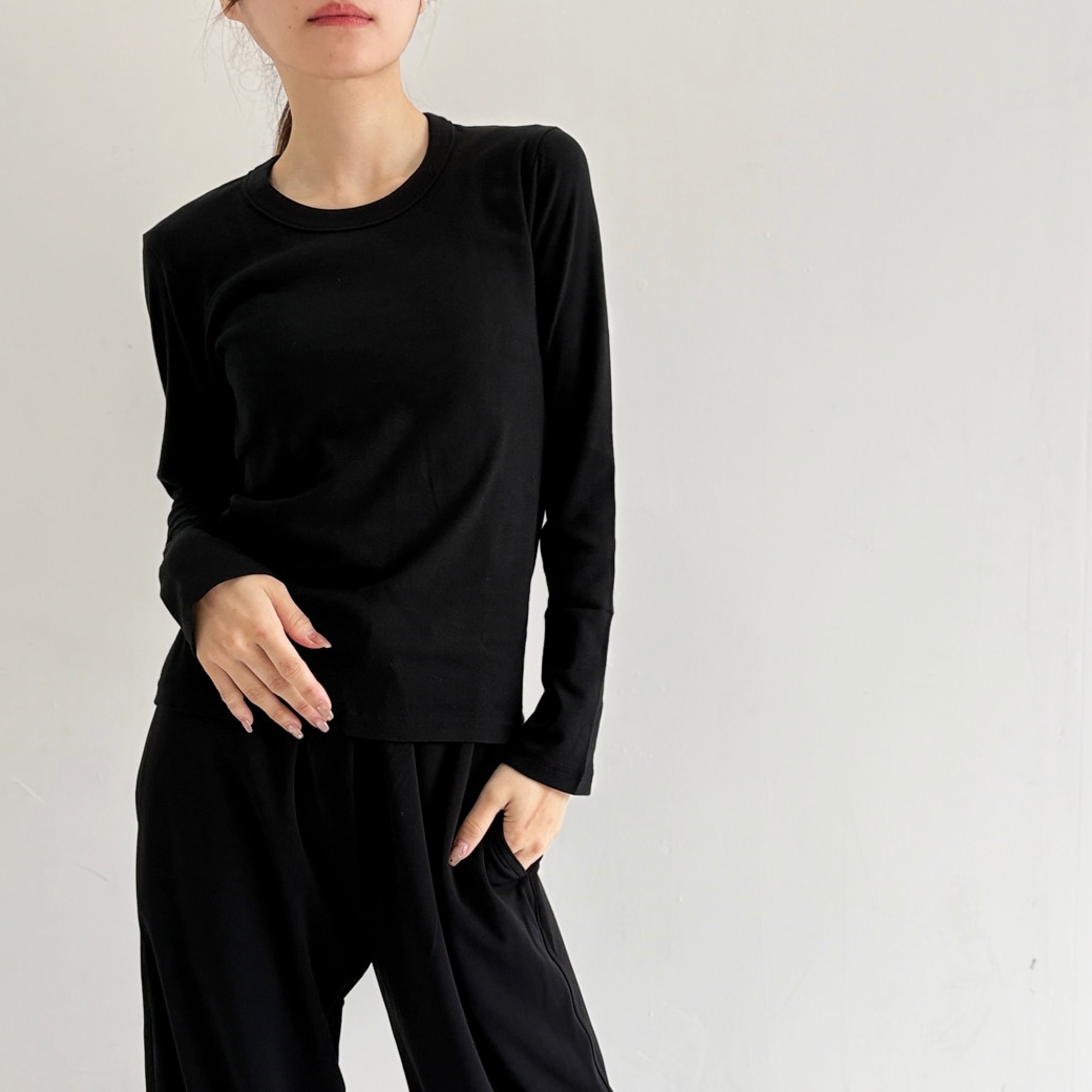 丸胴コットンシリーズのクルーネックより狭い衿あき 太目のリブ切り替えが特徴でカジュアルな着こなしにおススメ ジャケットのインナーでもきれいに収まります。